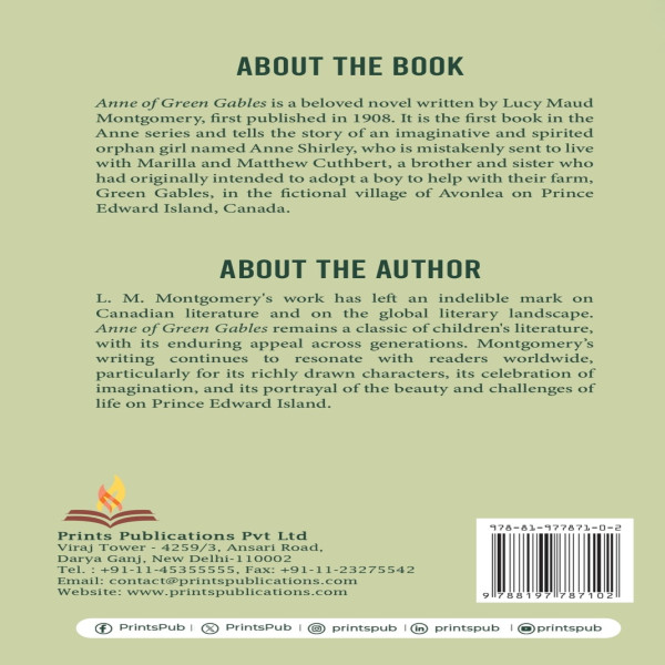 Anne of Green Gables is a beloved novel written by Lucy Maud Montgomery, first published in 1908. It is the first book in the Anne series and tells the story of an imaginative and spirited orphan girl named Anne Shirley, who is mistakenly sent to live with Marilla and Matthew Cuthbert, a brother and sister who had originally intended to adopt a boy to help with their farm, Green Gables, in the fictional village of Avonlea on Prince Edward Island, Canada.