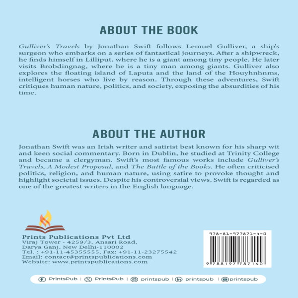 Gulliver's Travels by Jonathan Swift follows Lemuel Gulliver, a ship's surgeon who embarks on a series of fantastical journeys. After a shipwreck, he finds himself in Lilliput, where he is a giant among tiny people. He later visits Brobdingnag, where he is a tiny man among giants. Gulliver also explores the floating island of Laputa and the land of the Houyhnhnms, intelligent horses who live by reason. Through these adventures, Swift critiques human nature, politics, and society, exposing the absurdities of his time.