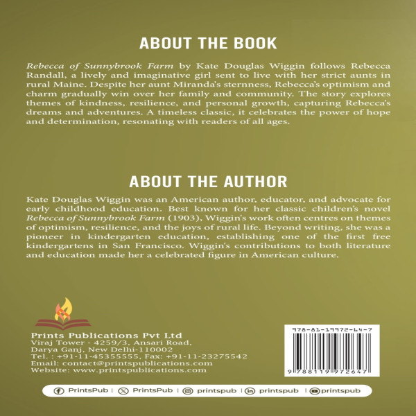 Rebecca of Sunnybrook Farm by Kate Douglas Wiggin follows Rebecca Randall, a lively and imaginative girl sent to live with her strict aunts in rural Maine. Despite her aunt Miranda's sternness, Rebecca’s optimism and charm gradually win over her family and community. The story explores themes of kindness, resilience, and personal growth, capturing Rebecca's dreams and adventures. A timeless classic, it celebrates the power of hope and determination, resonating with readers of all ages.