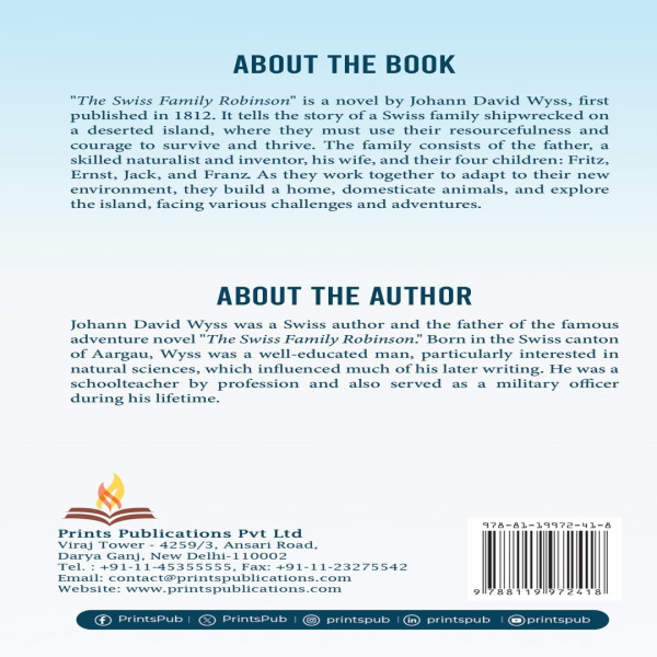 "The Swiss Family Robinson" is a novel by Johann David Wyss, first published in 1812. It tells the story of a Swiss family shipwrecked on a deserted island, where they must use their resourcefulness and courage to survive and thrive. The family consists of the father, a skilled naturalist and inventor, his wife, and their four children: Fritz, Ernst, Jack, and Franz. As they work together to adapt to their new environment, they build a home, domesticate animals, and explore the island, facing various challenges and adventures.