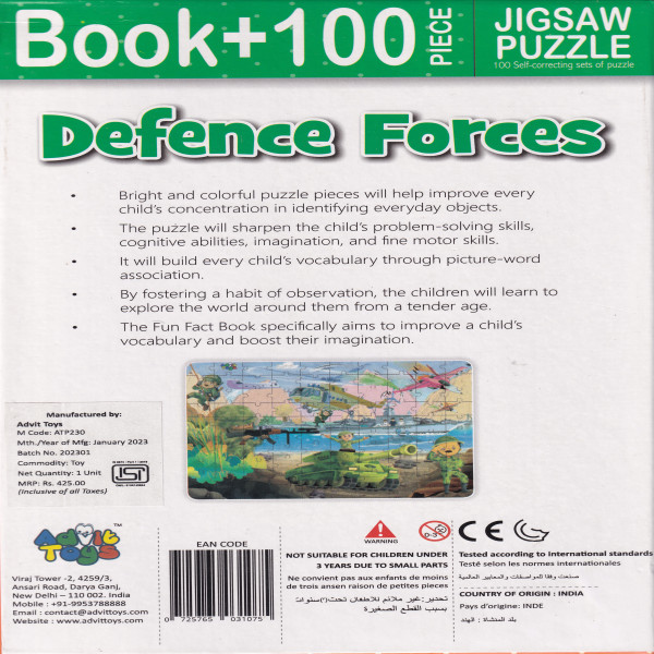 About the Book: Our Defence Force Book,helps to enhance the knowledge of children while encouraging them to develop the habit of reading. Through its attractive illustrations, Advit Toys strives to make learning a joyful experience for kids. Not only it is fun and interactive, but also educational.