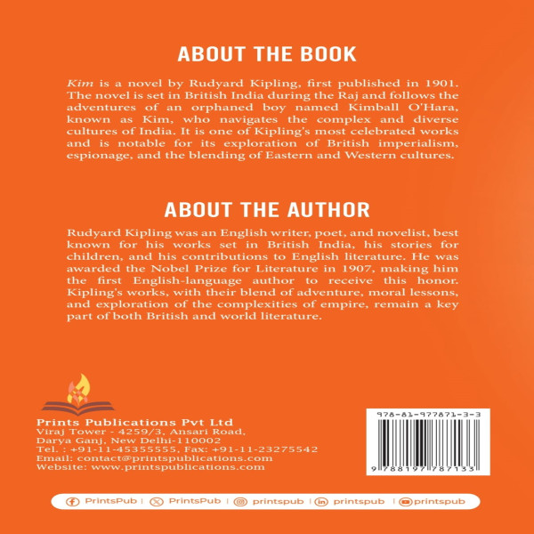 Kim is a novel by Rudyard Kipling, first published in 1901. The novel is set in British India during the Raj and follows the adventures of an orphaned boy named Kimball O'Hara, known as Kim, who navigates the complex and diverse cultures of India. It is one of Kipling's most celebrated works and is notable for its exploration of British imperialism, espionage, and the blending of Eastern and Western cultures.