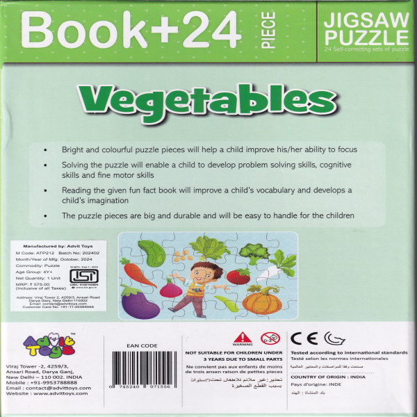 About the Book: Our Vegetables -themed book helps to enhance the knowledge of children while encouraging them to develop the habit of reading.Through its attractive illustrations, Advit Toys strives to make learning a joyful experience for kids. Not only it is fun and interactive, but also educational.